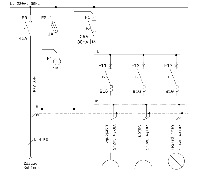 Przewody czynne np. przewody fazowe (+ opcjonalnie neutralny) w takich schematach łączymy ze sobą, zamiast kilku kresek, kilku przewodów o różnych funkcjonalnościach, mamy właśnie jedną kreskę symbolizującą, że do danego elementu doprowadzone jest zasilanie, a od niego zasilone jest inne zabezpieczenie lub urządzenie itp.